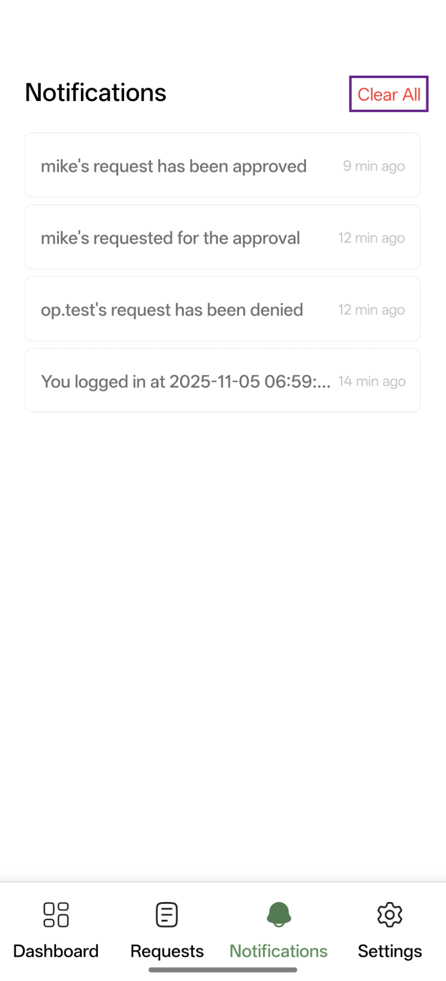 The Notifications tab displays all user-related notifications, such as request approvals, login activity, and other system alerts. It helps users stay informed about recent actions and updates within the application.