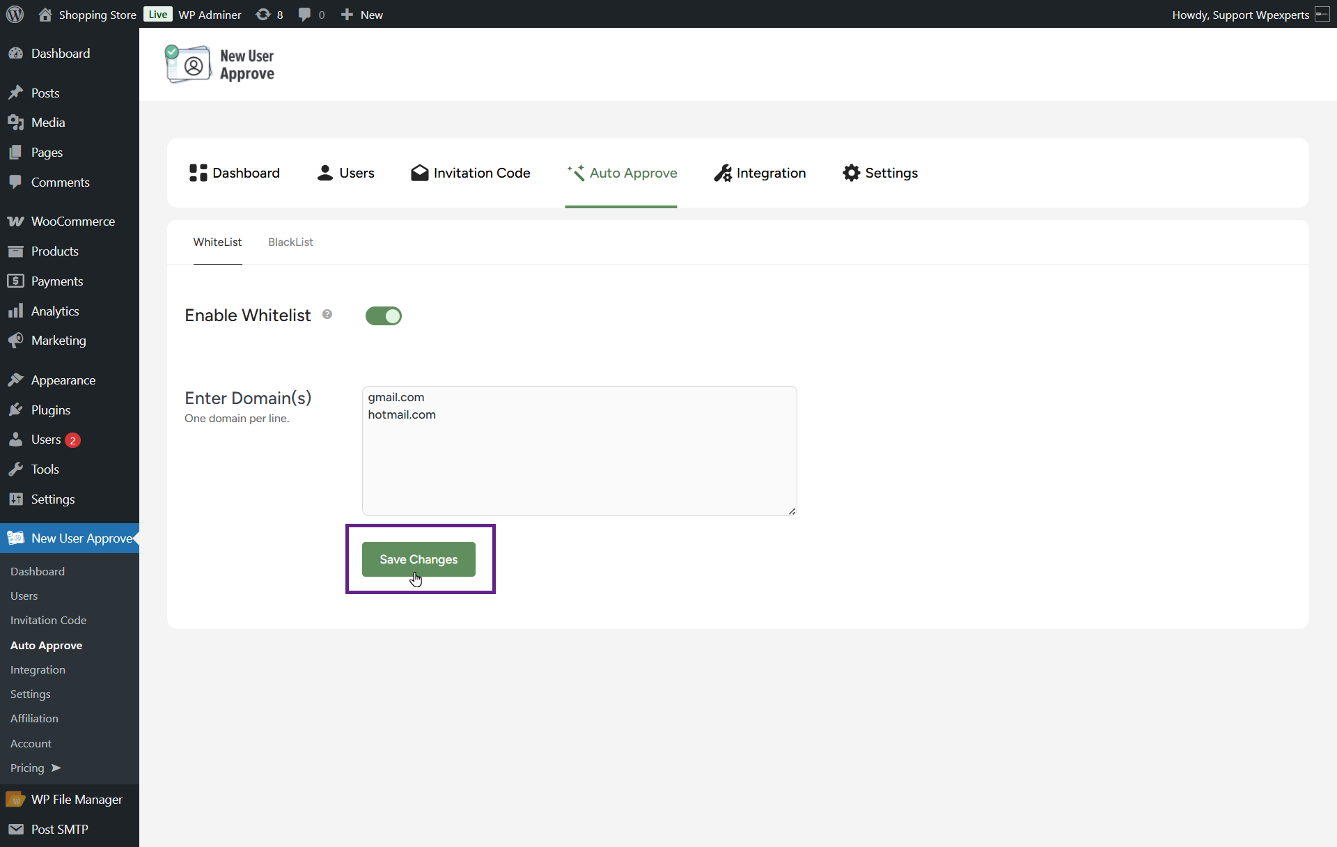 - Activate the Enable Whitelist toggle button. This option allows users with specified domains to be automatically approved.