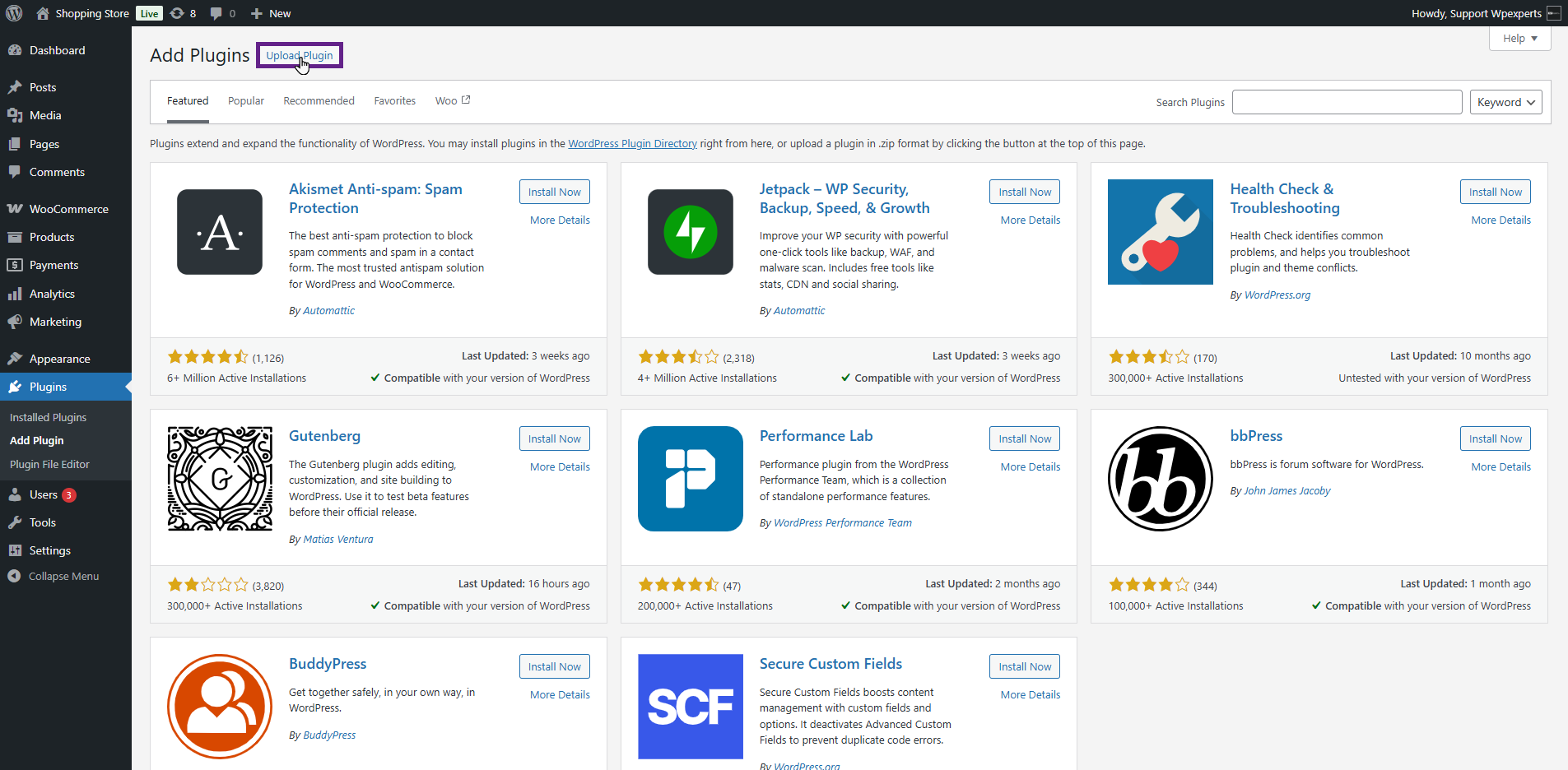 - Go to the Admin Dashboard > Plugins > Add New Plugin.