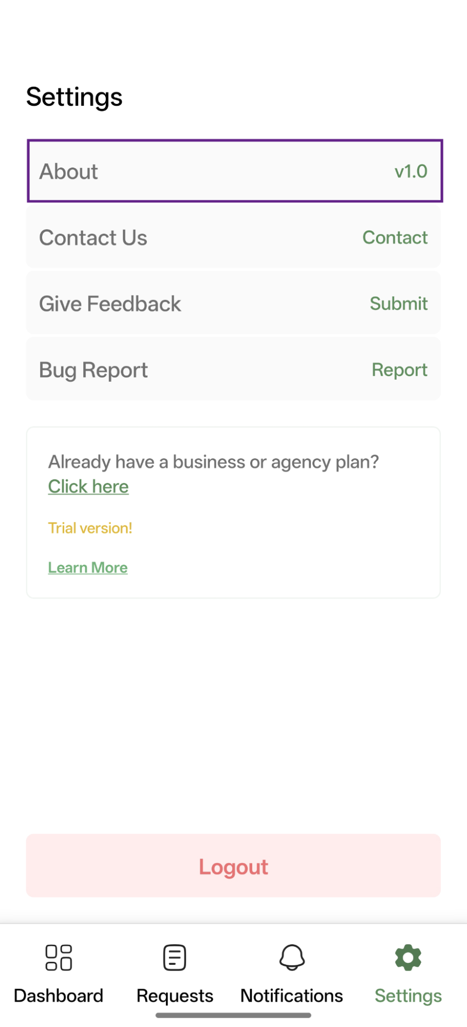 The Settings tab allows the admin to manage app-related options such as viewing app information, contacting support, submitting feedback, and reporting bugs. It also provides logout functionality and links for business or agency plan users.