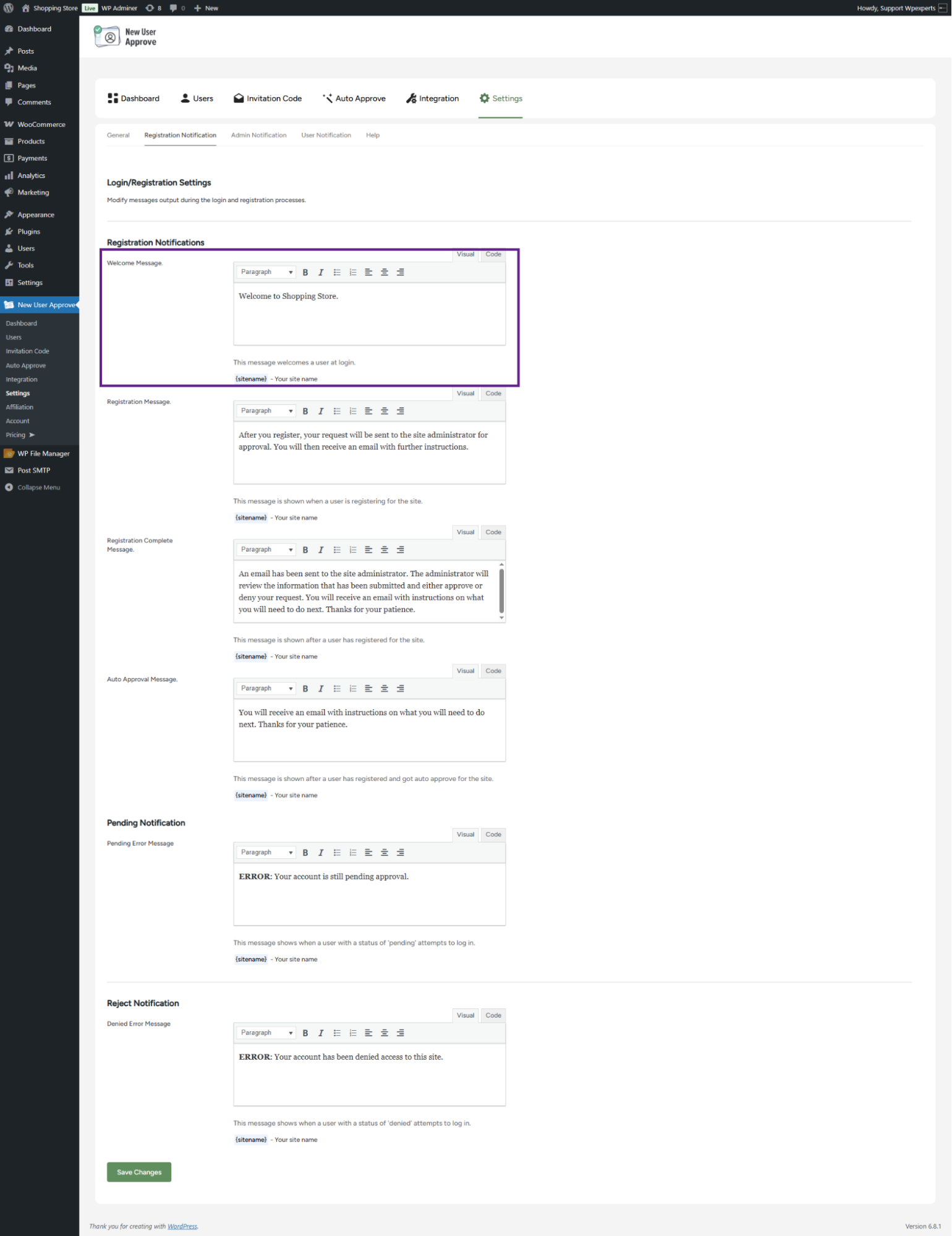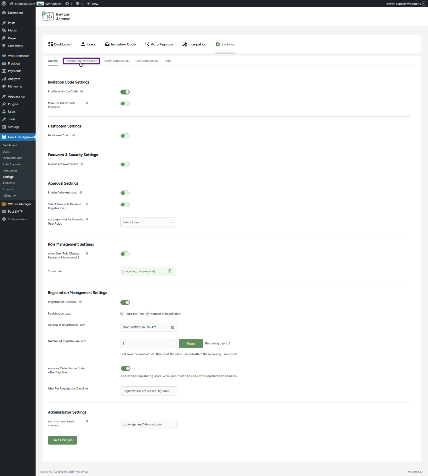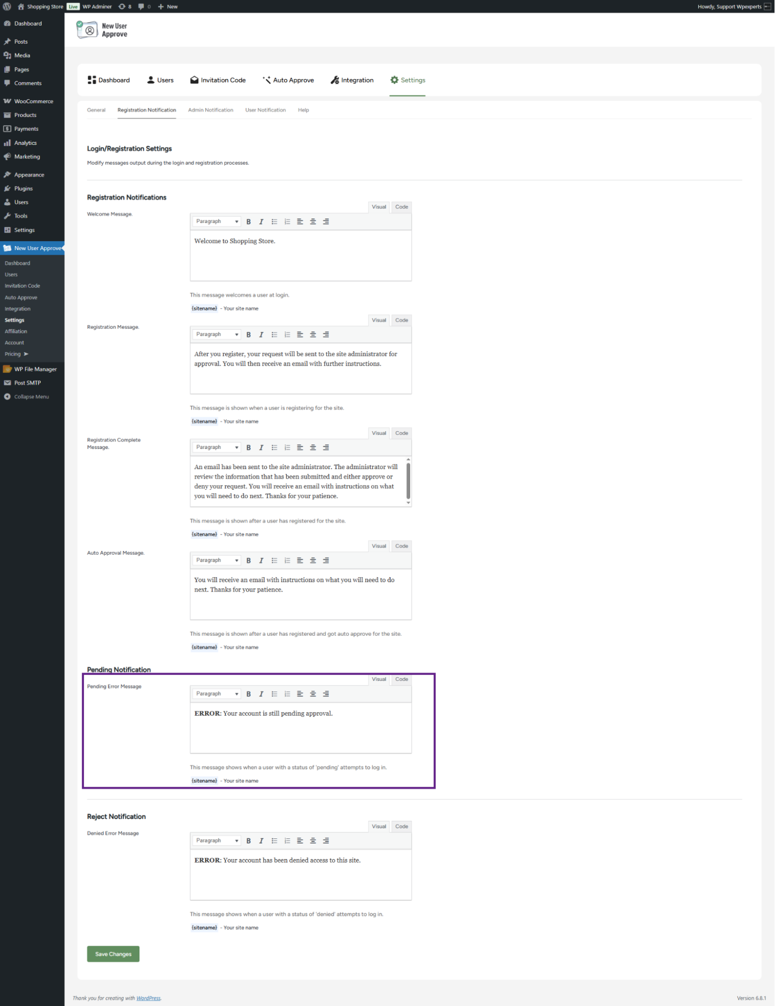 - Under the Registration Notification sub-tab, the admin can customize the registration, pending, and rejection notifications.