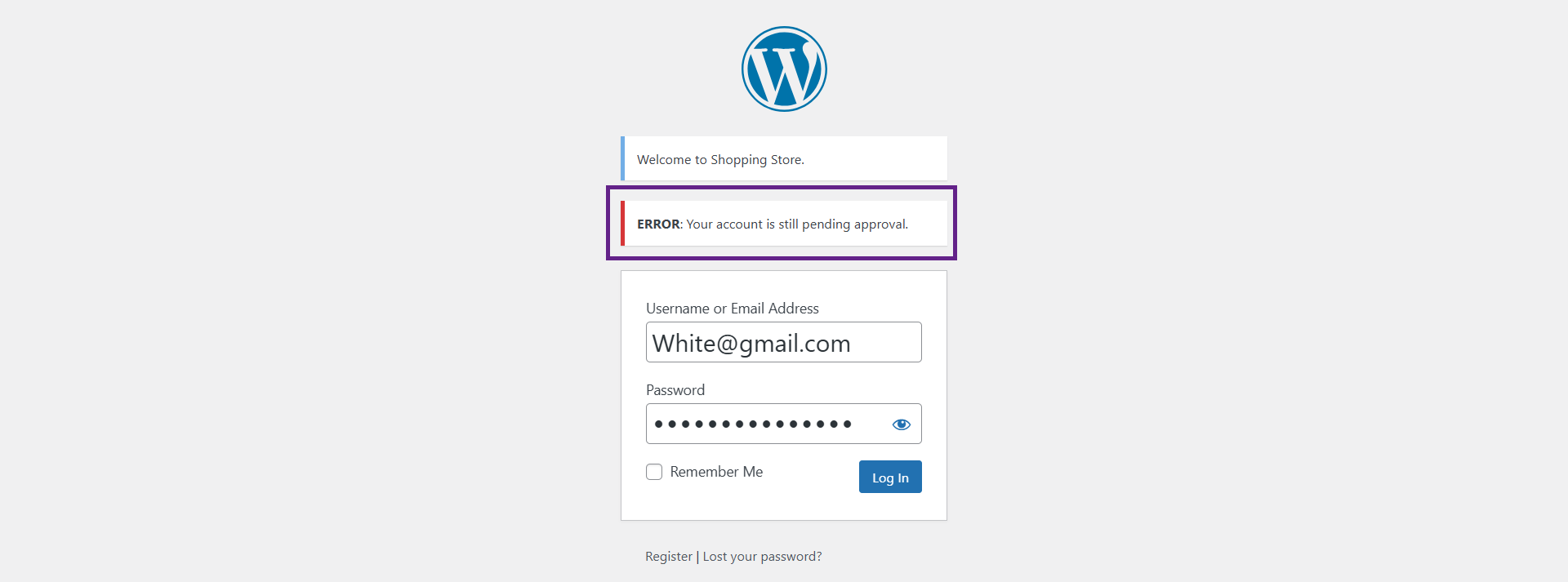 - The Pending Error Message is displayed to the user when the user has applied for registration on the site and their request has not been approved yet. If the user tries to log in to the website, then this message can be used to display that their registration request is still pending.
