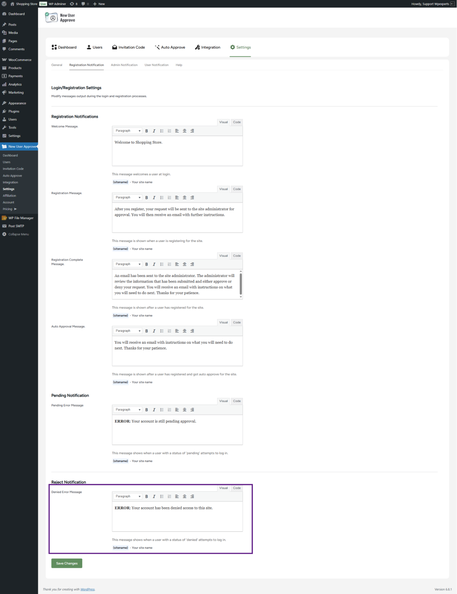 - The Denied Error Message allows a custom prompt to be shown to users whose registration requests have been denied. If a user whose request was denied attempts to log in, the specified message will be displayed.